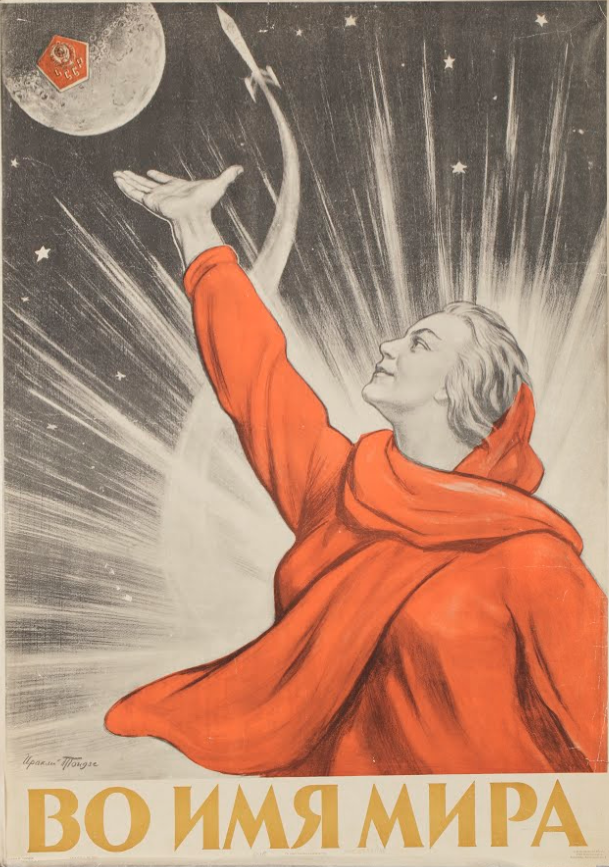 On 17th December, 2020, the successful return of lunar samples to earth of Chang’s 5 excited patriots in China as well as people who care about the space programme. The latter kind of people always admire the time of the Space Race between the United States (US) and the Soviet Union (USSR) during the Cold War as a period of dream for the prosperity of space exploration. However, even before USSR’s launch of the first artificial earth satellite Sputnik 1, Americans had been aware of the propaganda potential of space programmes. After officials of USSR seen the great impact of Sputnik 1 on the west, the space programme was related strongly to, even bound up with political propaganda. The first poster for Soviet space programme, In the Name of Peace (see Figure 1, called ‘Peace’ for short later), was created in 1959 by the famous Soviet poster artist, Irakli Toidze. In this poster, such relationship can be revealed.