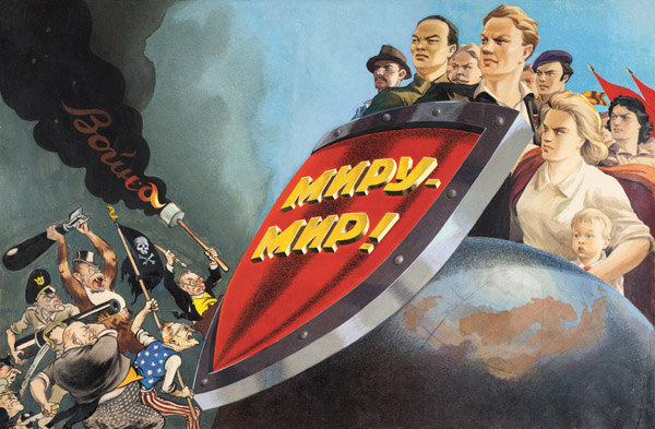 The phrase on the bottom of this poster, ‘во имя мира’, means ‘In the name of peace’ in English, which is taken as the title of this poster by most people. Natalia Sidlina, one of the curators of the Science Museum’s new exhibition, explains that ‘with the nuclear bomb drops on Japan at the end of WW2 little more than a decade before, Moscow was keen to stress that as far as space exploration was concerned, everything was peaceful.’ In fact, ‘peace’ had always been a keyword in Soviet propaganda. They condemned the west as the threat of world peace and was willing to show that the Soviet is the defender of peace. This propaganda strategy is more apparent in the poster World Peace (see figure 2).