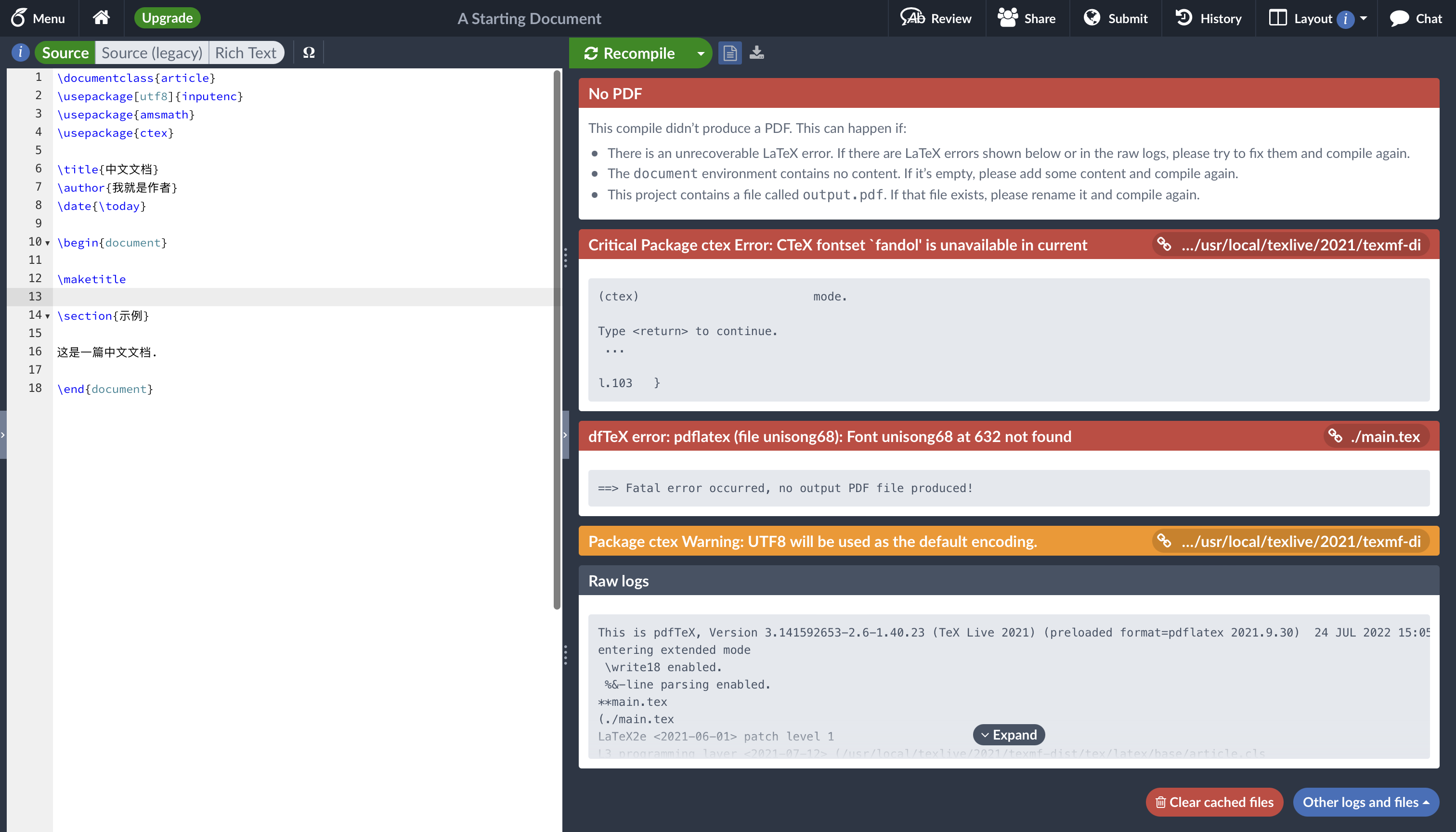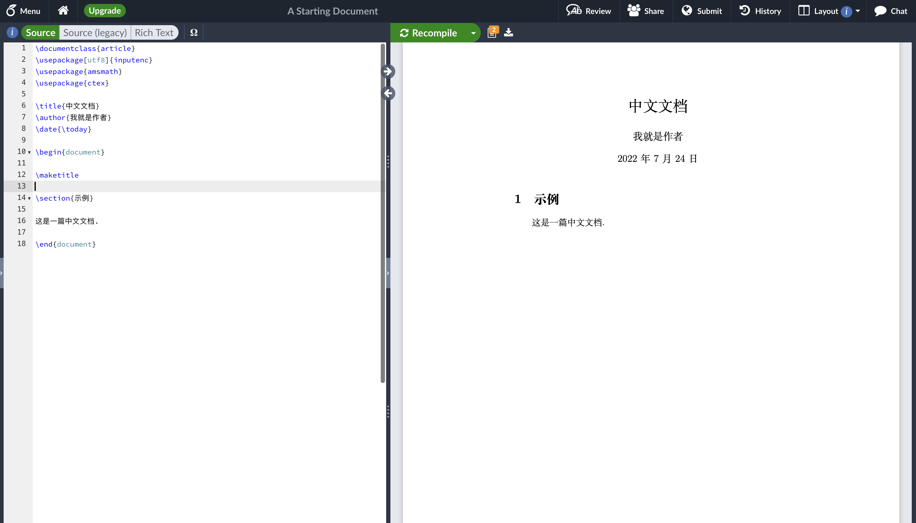 到目前为止我们已经做出了一个英文的文档, 下面我们来制作一个中文文档. 在一些文物级别的 LaTeX 介绍中, 你会看到一个叫作 CTEX 套装的东西, 如果你点进它的官网, 你会发现它最后一次更新在 2012 年1. 所以我们的建议是就让这个套装优雅地停留在上一代学者的记忆中吧.