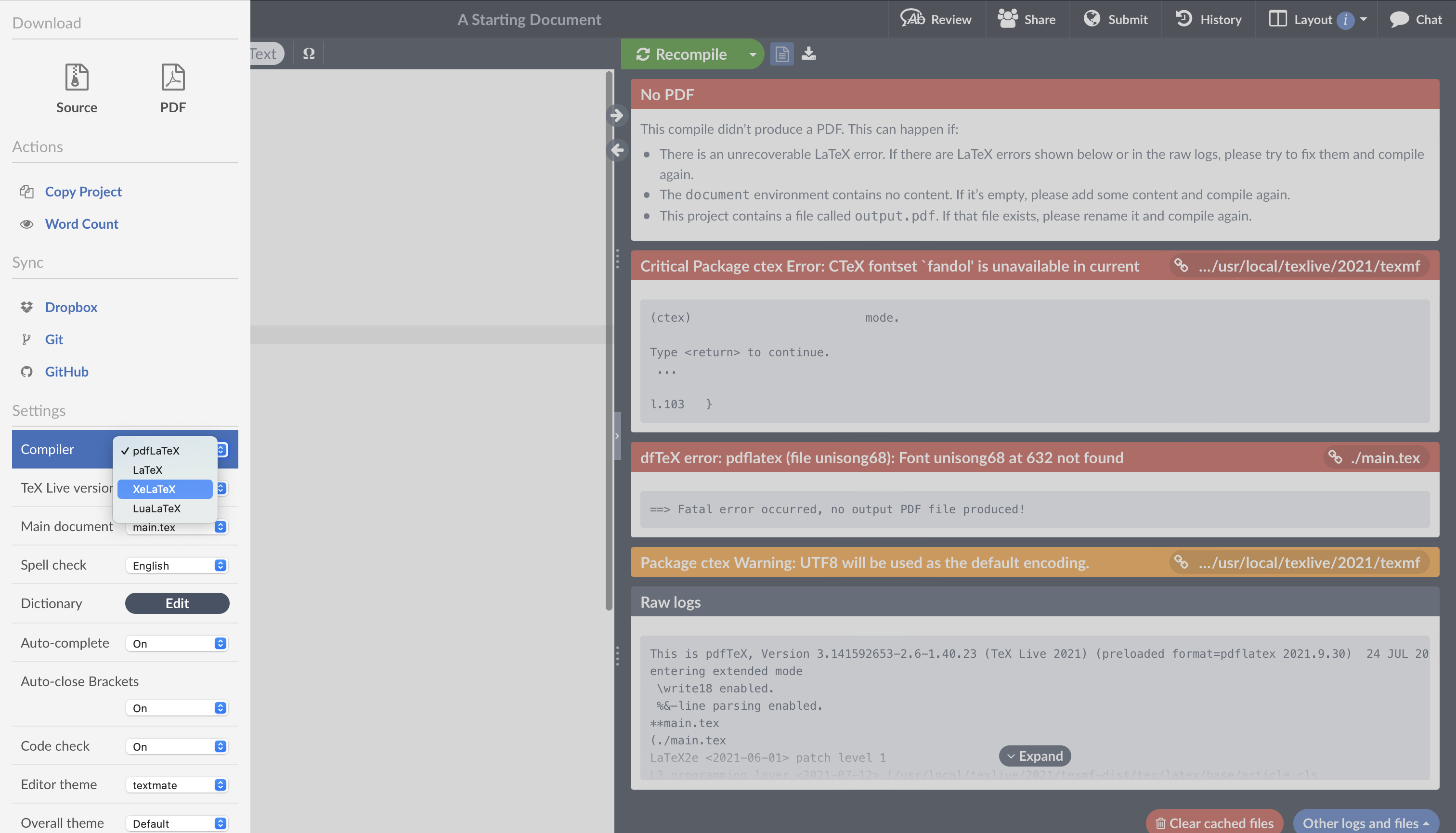 出错的原因是, Overleaf 默认使用 pdfLaTeX 程序编译, 这种编译器 (compiler) 不支持中文. 点击页面左上角的 Menu, 将 Compiler 勾选为 XeLaTeX, 如下图.