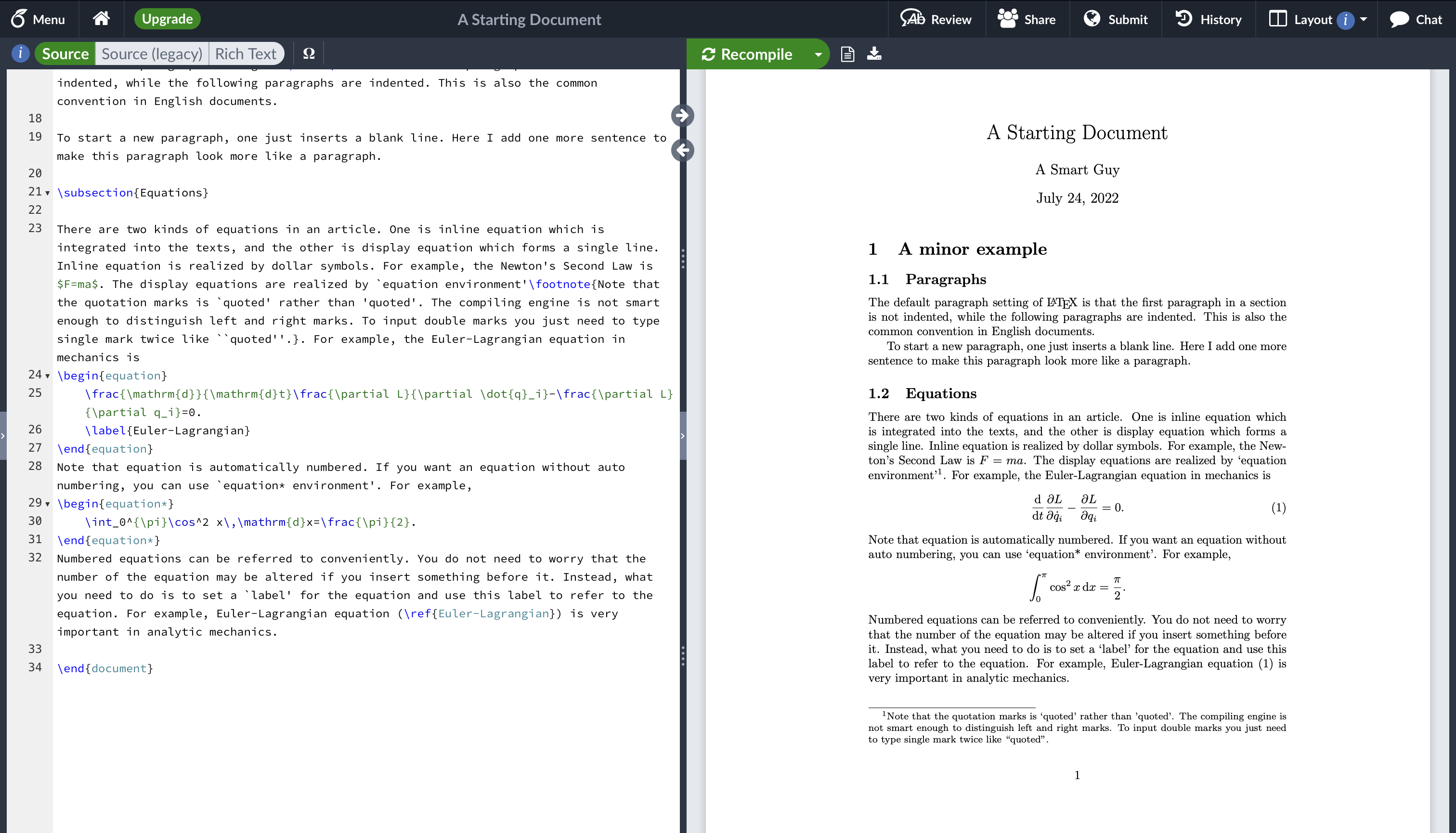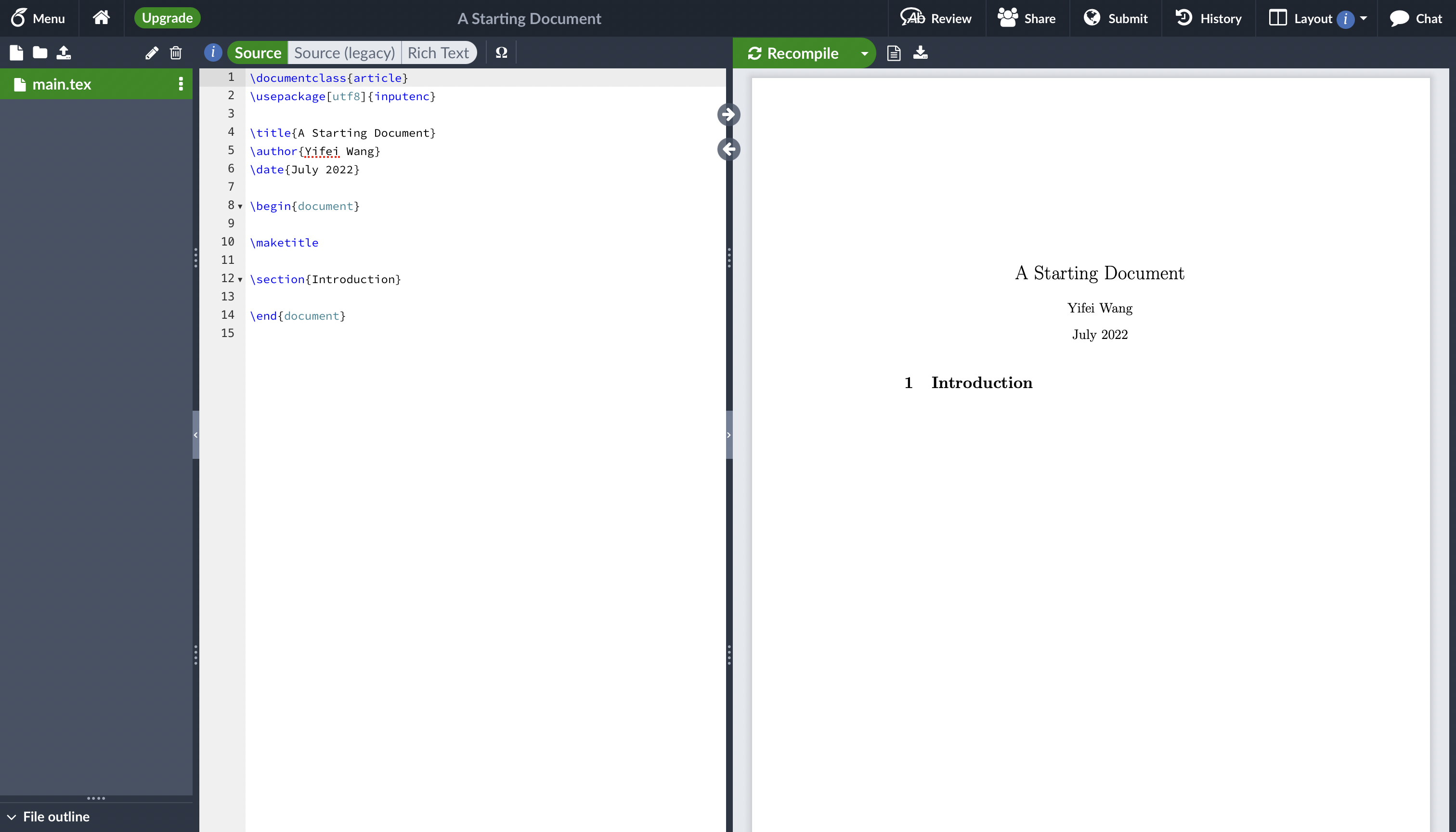 此时我们可以看到界面分三个部分, 最左边是文件树 (file-tree), 在涉及多文件编辑时可以方便地切换文件, 这里我们只有一个文件 main.tex, 因此可以点击中间的小箭头将其收起. 源文件 (source) main.tex 的内容在中间一栏展示, 我们的所有编辑和改动都是在源文件上进行的, 源文件经过编译 (compile) 将得到一个 PDF 文件, 在界面右侧.
