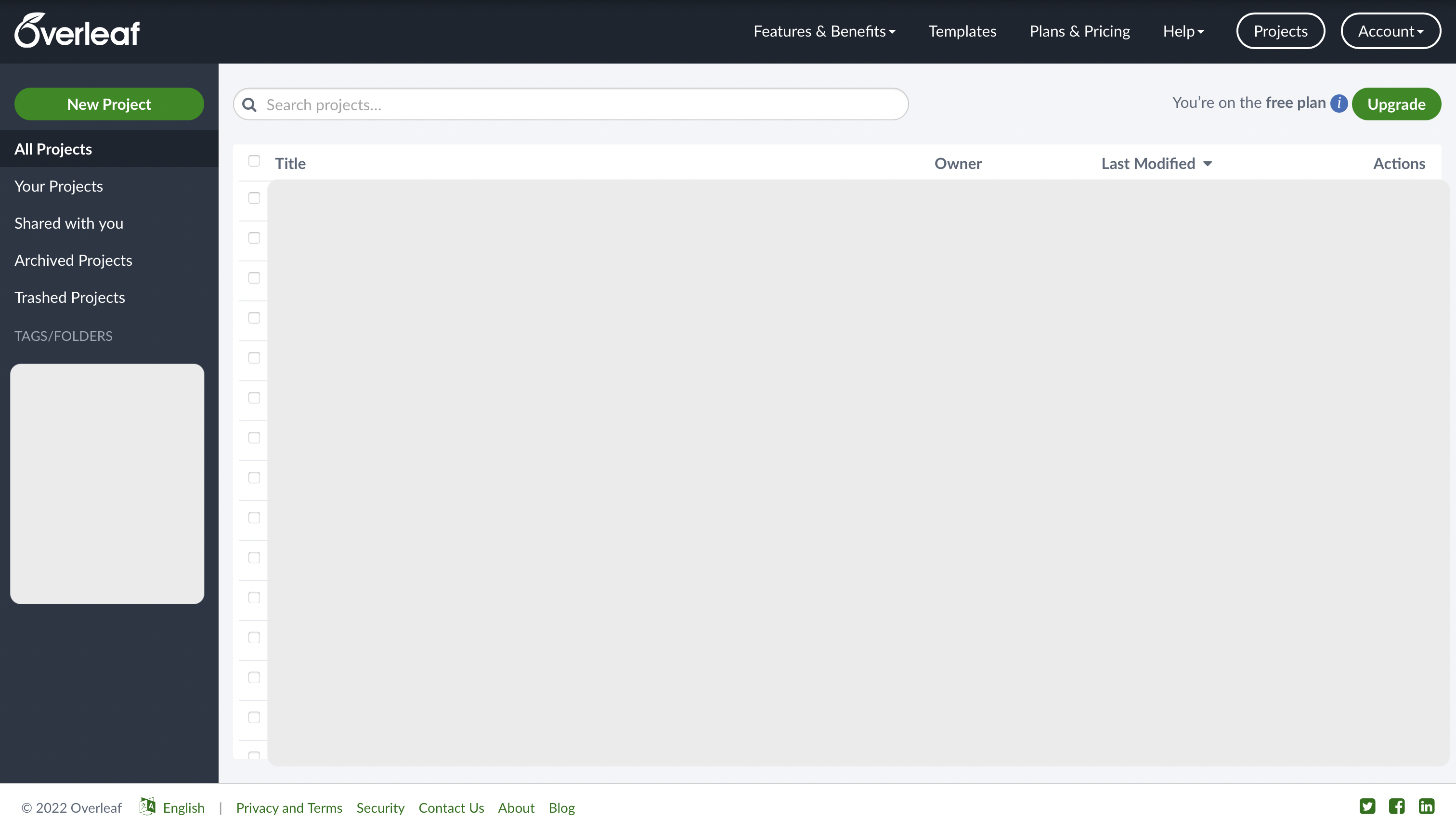第一步, 进入 Overleaf 或对应的中文版, 免费注册账号并登录. 本文后续的演示以英文版为例.
